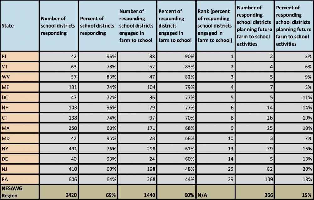 The results of the 2015 Farm to School Census are in and the NESAWG region is once again showing their love for farm to school. Approximately 60% of all districts in our region who responded to the census have farm to school activities, exceeding the national rate of participation by 18 percentage points! This amounts to nearly 8,000 schools and more than four million students participating in farm to school. In addition, nine NESAWG states rank in the top ten states with the highest percentage of school districts with Farm to School activities.