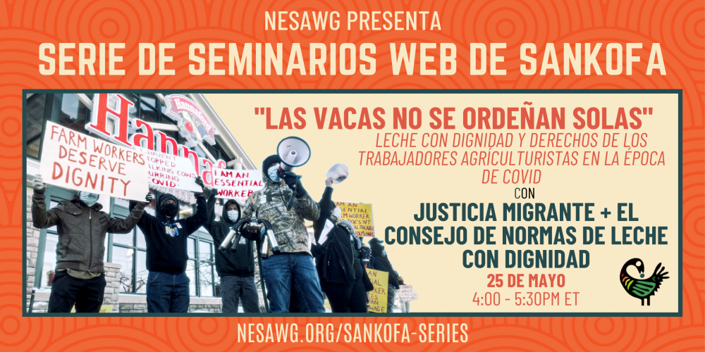 Durante la crisis del Corona Virus, los trabajadores agrícolas migrantes continuaron trabajando día a día para producir la leche y los productos lácteos que llenan los estantes de los supermercados. Únase a El Consejo de Normas de Leche con Dignidad (Migrant Justice and the Milk with Dignity Standards Council) para una presentación de 1.5 horas para obtener más información sobre el innovador programa leche con dignidad (Milk with Dignity) que reúne a trabajadores agrícolas, consumidores, propietarios de agricultores y compradores corporativos para fomentar una industria láctea sostenible del Noreste que avance los derechos humanos de los trabajadores agrícolas, los intereses a largo plazo de los propietarios de granjas y proporciona una cadena de suministro ética para las empresas minoristas de alimentos y los consumidores. A través de leche con dignidad (Milk with Dignity), los trabajadores agrícolas se han asegurado importantes protecciones para su salud y seguridad incluso cuando la pandemia ha puesto a prueba muchas cadenas de suministro hasta el límite. Sabemos que las vacas no se ordeñan solas: aprendan mas de como se pueden envolver y ayudar a expander esta solución poderosa a la cadena de supermercados de Hannaford.