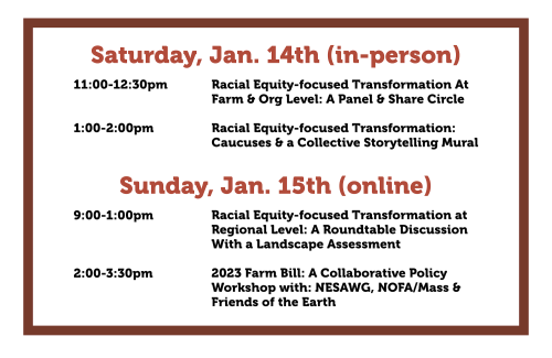 During this past January, NESAWG partnered with NOFA/Mass to bring you our first NESAWG Conference Track full with storytelling, share circles, caucusing, Farm Bill training and advocacy, panel shares, collective art liberation murals, community organizing, movement building and more!